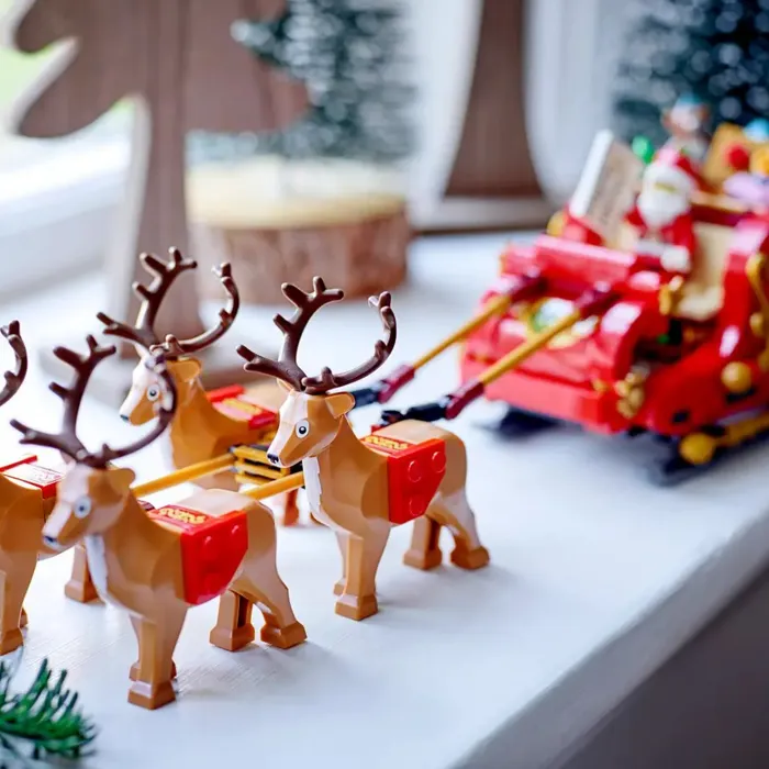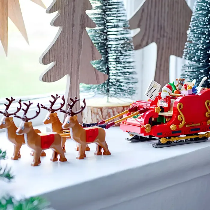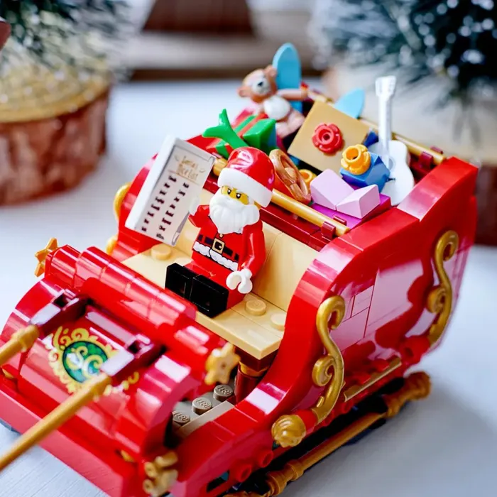 - Indeholder en minifigur af julemanden, 4 rensdyrfigurer med aftagelige, dekorerede sadler, 8 "indpakkede" gaver, der kan bygges, samt en guitar, et par ski og en bamse.